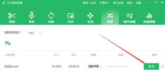 4.格式选定后,我们点击界面右侧的“提取”按钮,qve音频剪辑便开始提取视频中的音频。