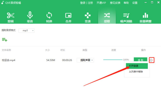 5.最后,当进度显示100%的时候,说明qve音频剪辑成功提取了视频中的音频。我们点击提取旁边的“…”按钮,从其选项中点击“打开目录”,便可以快速打开从视频中提取的音频文件了。