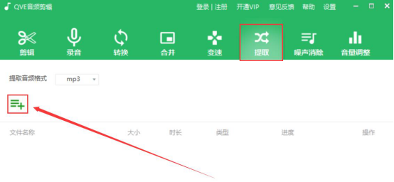 1.首先,我们打开qve音频剪辑。切换至“提取”功能界面,点击界面左侧的“+”按钮。