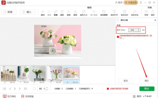 6.闪电GIF制作软件便会弹出图片制作成GIF动图的设置窗口,我们根据自己的需要设置延时值,并点击“确定”按钮。