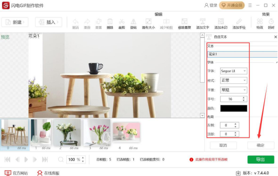 3.此时,闪电GIF制作软件便会弹出文本编辑界面,我们输入想要为该图片添加的文本内容,根据自己需要设置文本属性,再点击“确定”按钮。