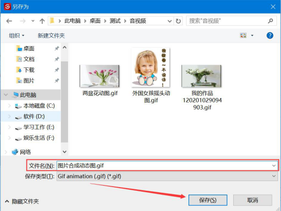 9.在弹出的窗口中,选择图片制作GIF动图后的文件保存路径,为了方便后续的查找,我们对文件重命名,再点击“保存”按钮。