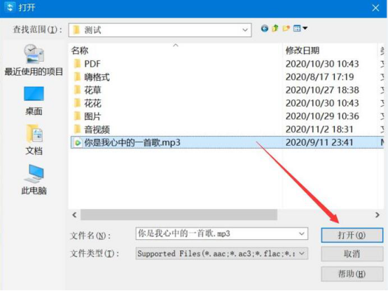 5.此时,会弹出如下窗口,我们将制作MV时的音乐文件选中,点击“打开”按钮,将其导入视频转换王。