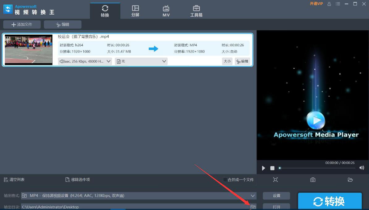 7、接下来,回到视频转换王的主操作界面。如果裁剪了画面后的视频的输出目录需要更改,就点击如下图的文件夹图标按钮。