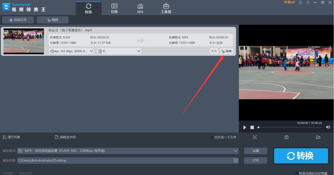3、然后,回到视频转换王的操作界面,点击导入的视频中的“编辑”按钮。