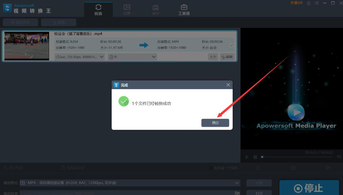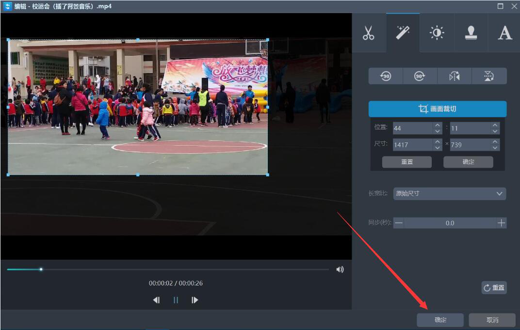 6、需要裁剪保留的视频画面选好后,我们点击视频转换王界面右下方的“确定”按钮。