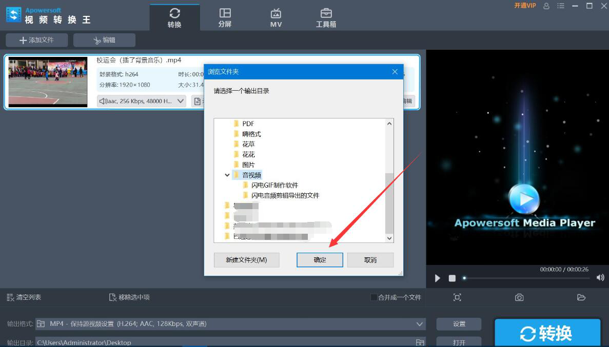 8、视频转换王便会弹出浏览文件夹窗口,我们从中选择视频裁剪画面后的保存路径,点击“确定”按钮。