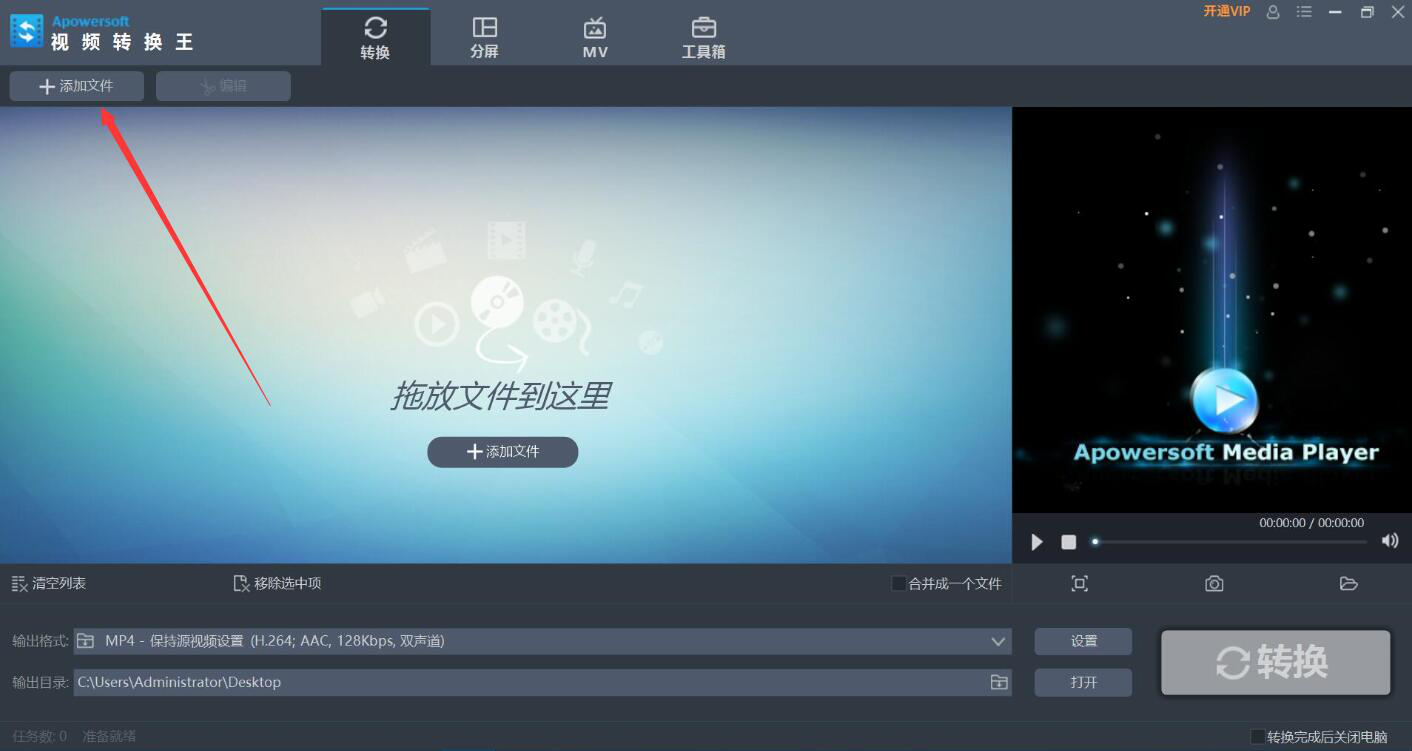 1、首先,我们打开视频转换王操作界面,点击左上方的“+添加文件”按钮。