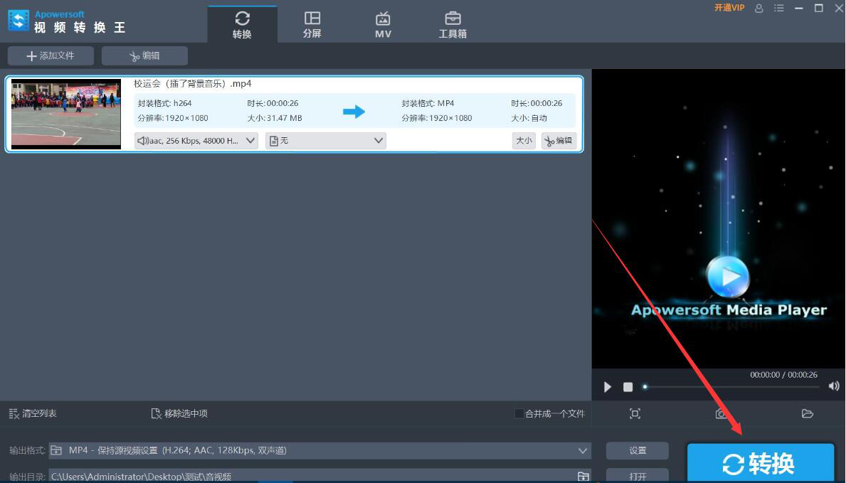 9、输出格式和输出目录都设置好了后,我们点击界面右下方的“转换”按钮,视频转换王便开始裁剪视频画面。