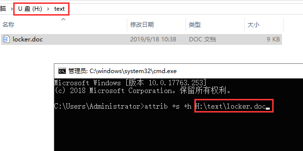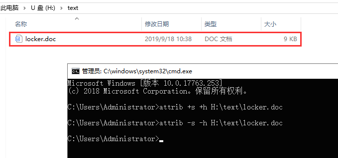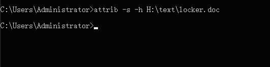 如果现在需要查看被隐藏的文件,同样打开命令行窗口,输入【attrib -s -h H:\\text\\locker.doc】,点击回车键,文件就会显示了。