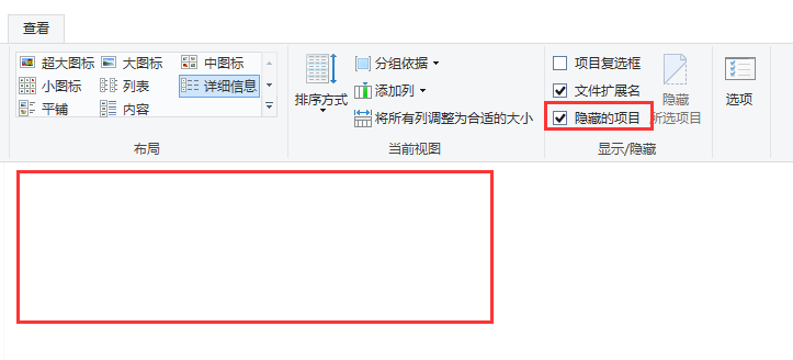 这时候查看文件是不是被隐藏了,无论是否勾选【隐藏的项目】,文件都不会显示出来,