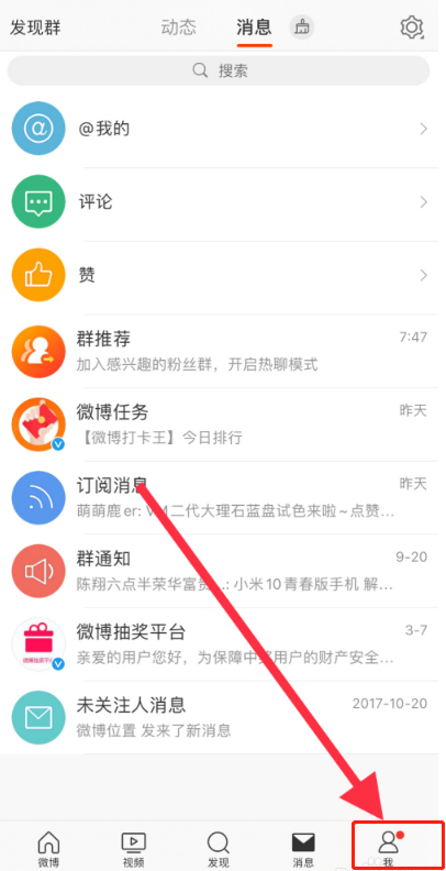 打开手机新浪微博,进入界面,点击右下角的【我】,