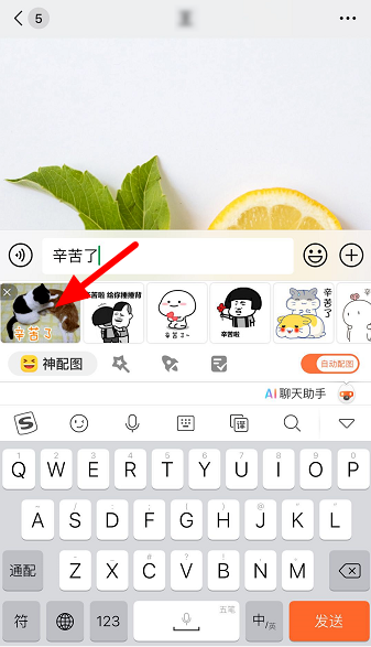 如图,切换搜狗输入法,输入文字,例如“辛苦了”,然后点击汪仔图标,选择【自动配图】,