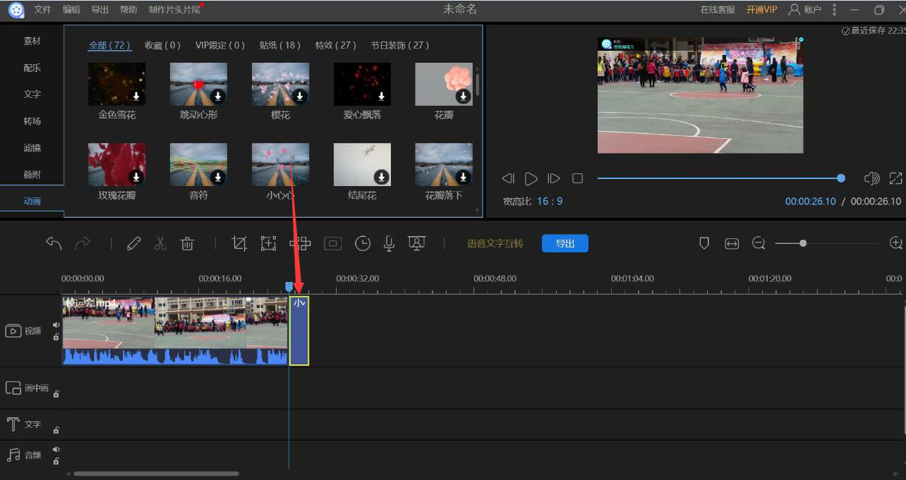 6、动画效果下载完成,我们单击它并按住鼠标左键将它拖放至视频编辑轨道的视频后面,如下图所示。