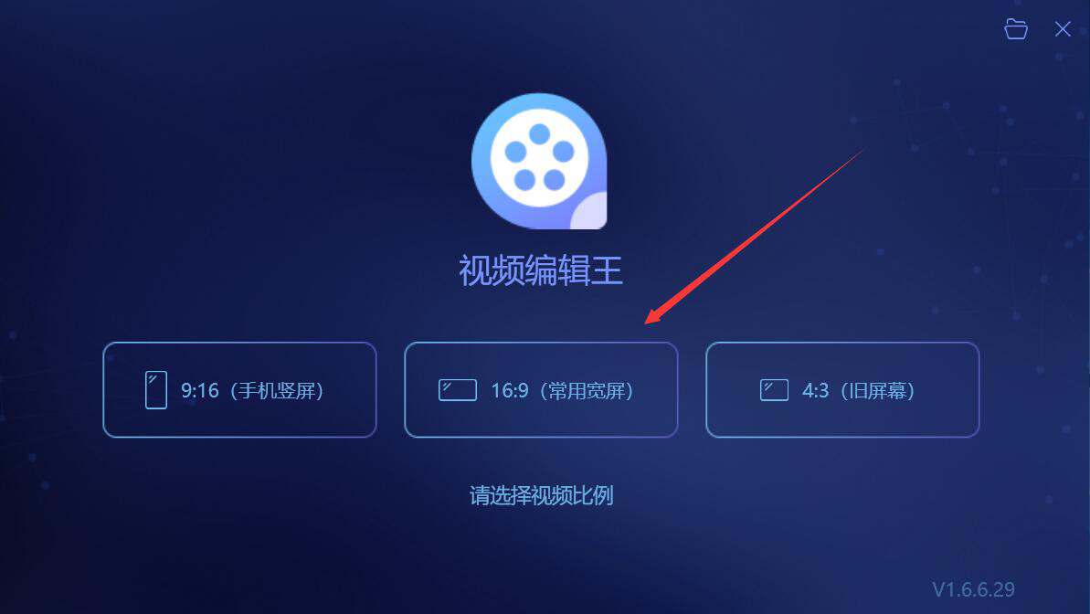 1、首先,我们打开视频编辑王,选择和自己的视频比例最为接近或者一样的比例,这里选择的是常用的宽屏16:9。