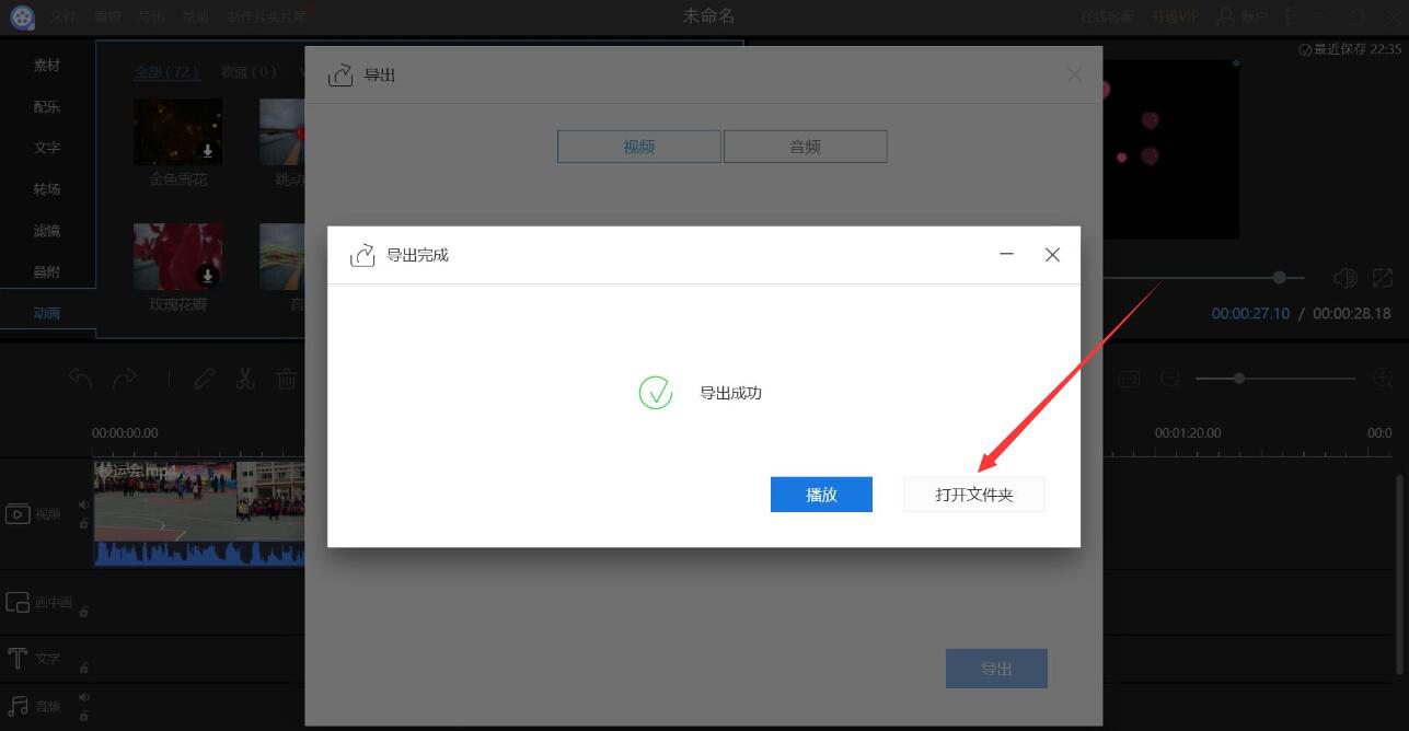10、最后,导出完成,我们点击“打开文件夹”按钮可以从保存路径中查看该视频文件。或者也可以点击“播放”按钮立即播放视频编辑王给视频添加动画后的效果。