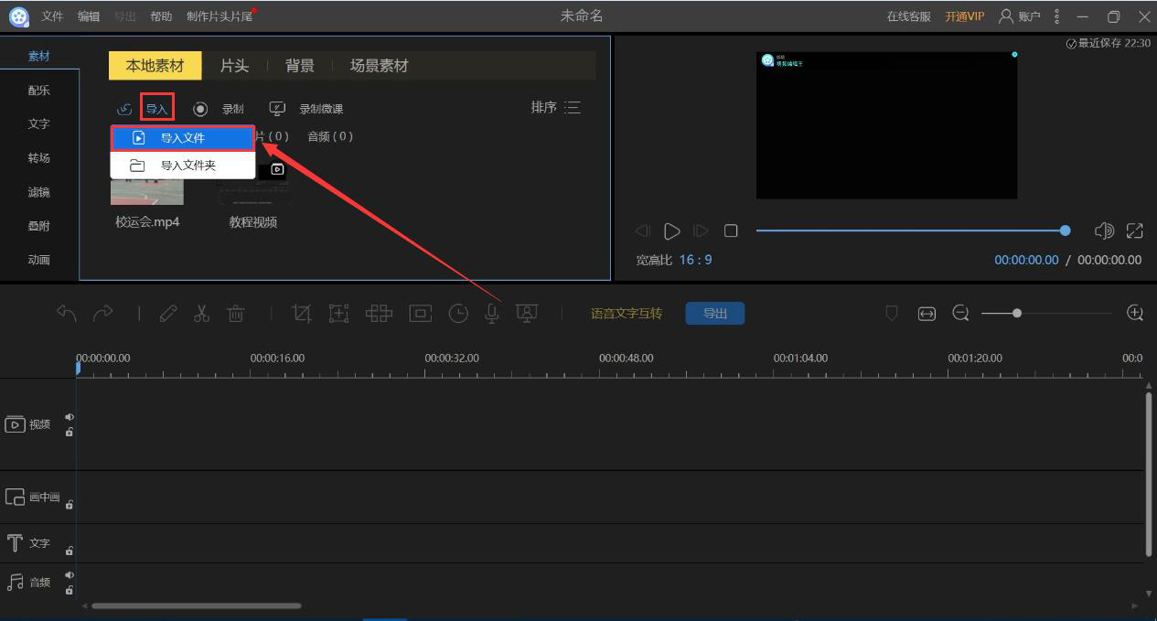 2、进入视频编辑王的操作界面,点击“导入”按钮,并在其选项中点击“导入文件”。