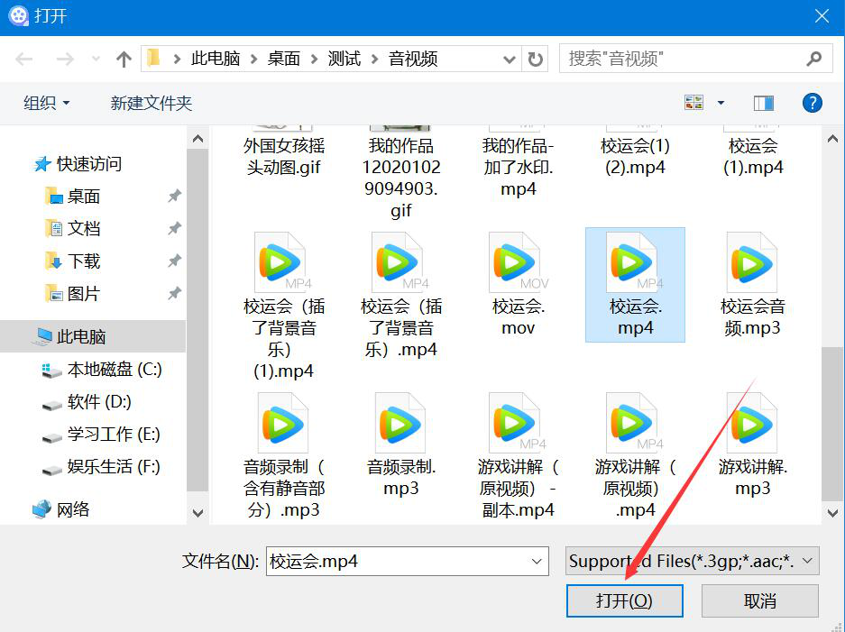 3、然后,在弹出的窗口中,将需要添加动画的视频文件选中,并点击“打开”按钮,将其导入视频编辑王。