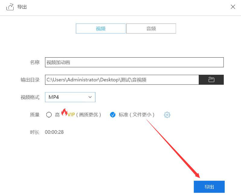 8、视频编辑王弹出导出窗口。我们根据自己需要来输入名称、设置输出目录、选择视频格式和质量,再点击“导出”按钮。