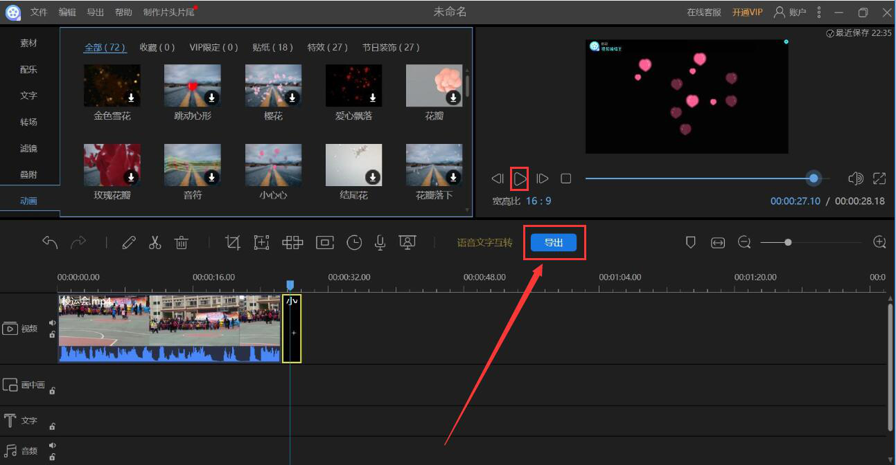 7、接着,我们可以点击视频预览窗口下方的播放按钮预览视频添加动画的效果,如果满意的话,就继续点击“导出”按钮。