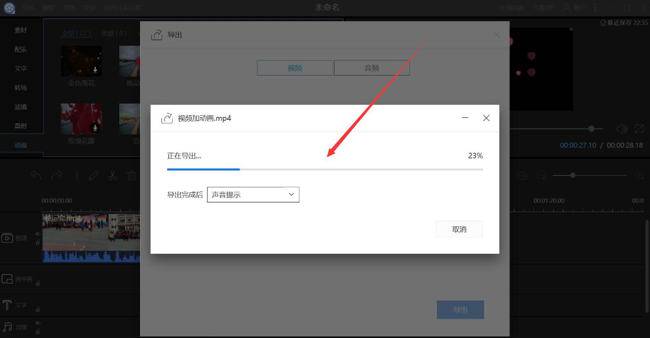 9、此时,我们可以在视频编辑王弹出的视频加动画的窗口中实时了解到具体的导出进度。