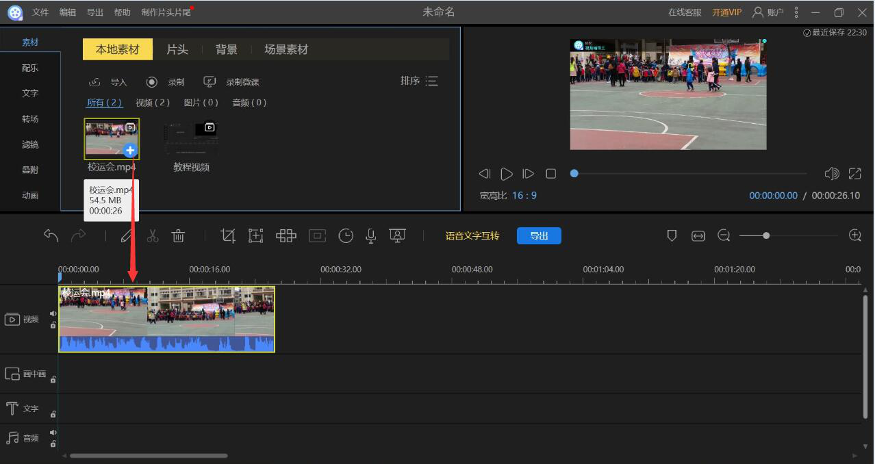 4、回到视频编辑王的操作界面,我们单击刚才导入的视频素材,它便会出现一个“+”号,我们点击“+”号,将该视频加载到视频编辑轨道,如下图所示。