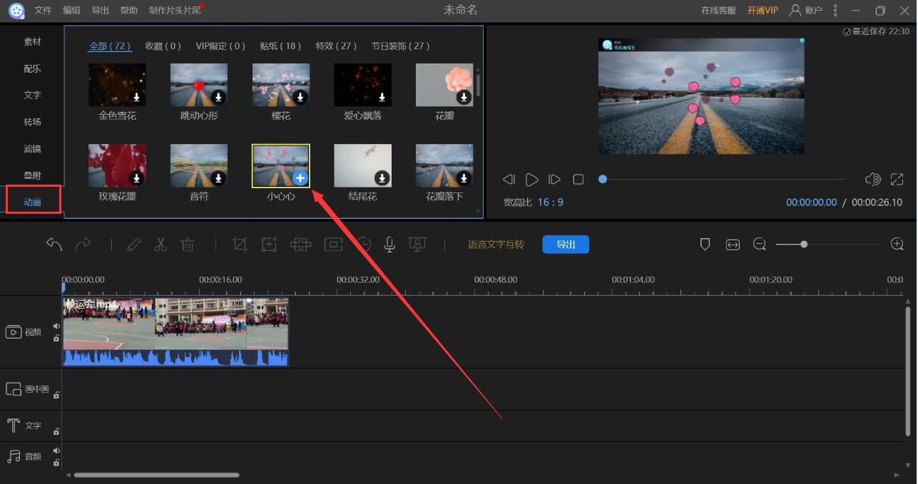 5、接下来,我们在视频编辑王的操作界面左侧,点击切换至“动画”选项,可以看到它有很多动画效果,点击自己喜欢的动画效果,即可自动下载并应用。例如这里,我们要给视频添加的是小心心的动画。
