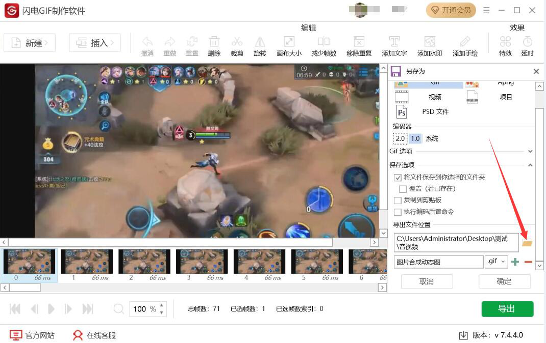 5、此时,闪电GIF制作软件操作界面右侧便会弹出另存为的设置窗口。如果视频做成GIF动态图的导出路径要更改,就点击该窗口中的文件夹图标按钮。