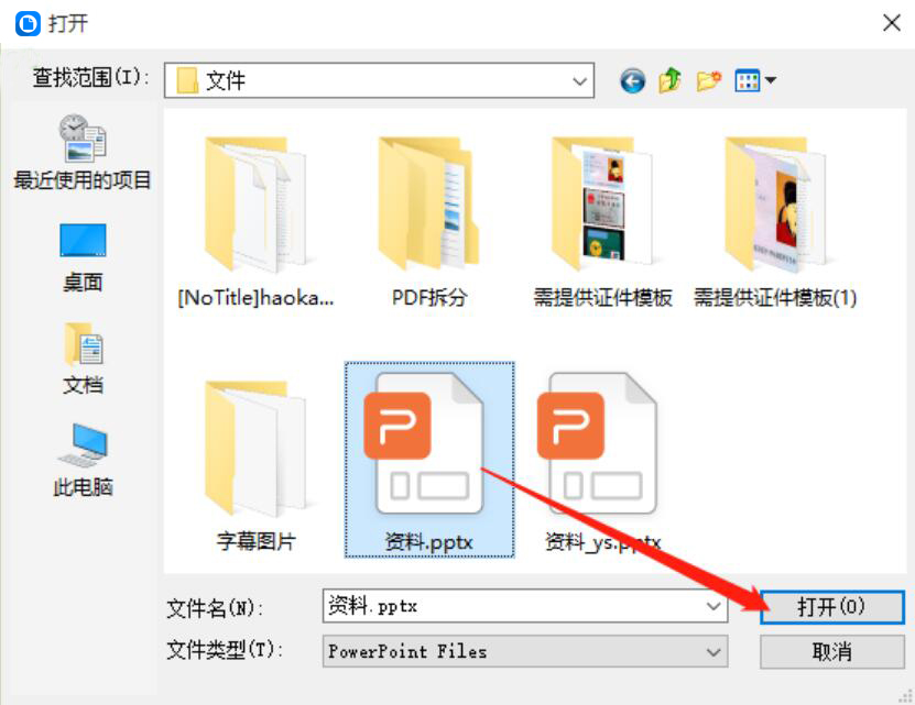 2、在弹出的窗口中,将需要转长图的PPT选中,点击“打开”按钮,将它导入神奇文档处理软件。