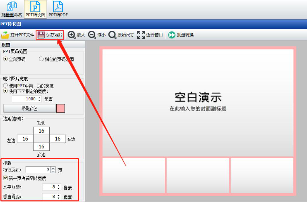 5、除此之外,我们还要设置PPT转长图时的排版、例如每行页数、水平和垂直的间距。设置好了,点击神奇文档处理软件的PPT转长图操作界面左上方的“保存照片”按钮。
