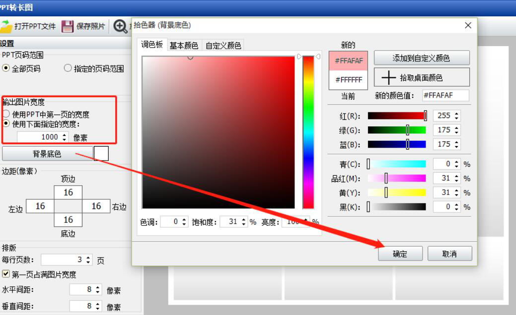 4、接下来,我们还可以根据自己的需要,设置PPT转长图时图片输出的宽度和背景底色。点击“背景底色”按钮时,会弹出颜色选择窗口,我们选择自己要的颜色,点击“确定”按钮即可。