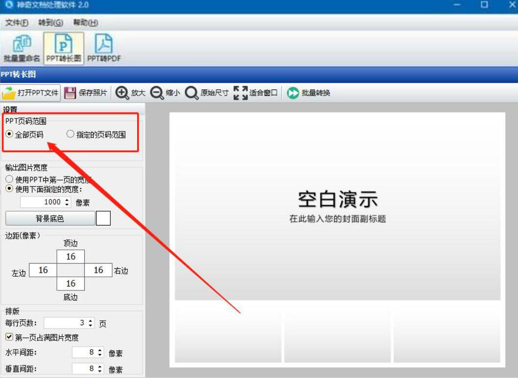 3、然后,回到神奇文档处理软件的PPT转长图操作界面。我们可以根据自己的需要设置PPT页码范围。例如这里点选“全部页码”,就是将PPT的全部幻灯片都转长图。