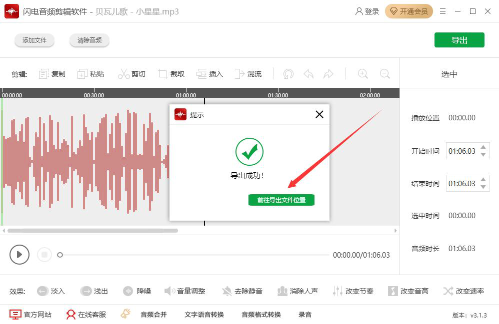 9、最后,如果弹出如下窗口提示,则说明闪电音频剪辑软件成功地将剪切了的音频文件保存起来了,点击“前往导出文件位置”按钮即可查看。