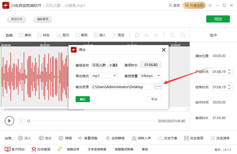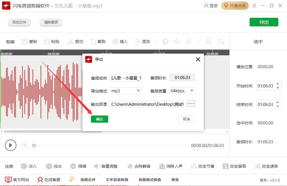 8、回到导出设置窗口,点击“确定”按钮,闪电音频剪辑软件便开始导出这个被剪切了的音频文件。