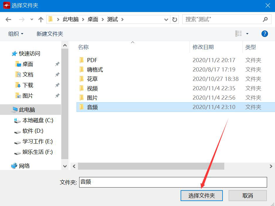 7、在弹出的窗口中,选择音频剪切后的保存路径,并点击“选择文件夹”按钮。