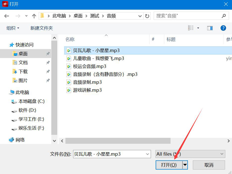 2、在弹出的窗口中,将需要剪切的音频选中,并点击“打开”按钮,将其导入闪电音频剪辑软件。