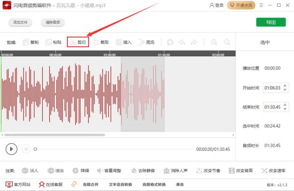 4、需要被剪掉的音频片段选择好了后,我们点击闪电音频剪辑软件中的“剪切”按钮。