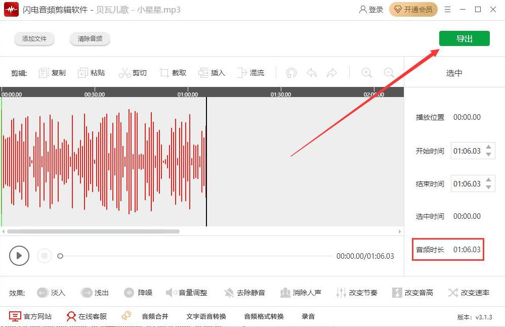 5、接下来,我们便可以发现音频的时长变短了,说明刚才选中的音频片段被闪电音频剪辑软件给剪掉了,点击界面右上方的“导出”按钮。
