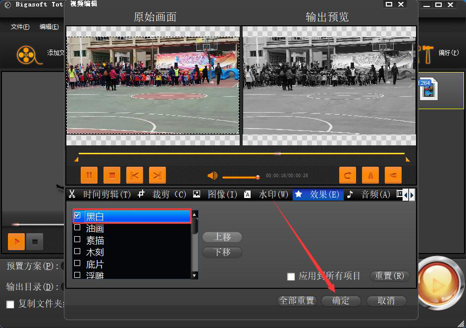 4、进入Bigasoft Total Video Converter的视频编辑窗口,勾选“黑白”效果,即可同步预览彩色视频变成黑白视频的效果,再点击“确定”按钮。