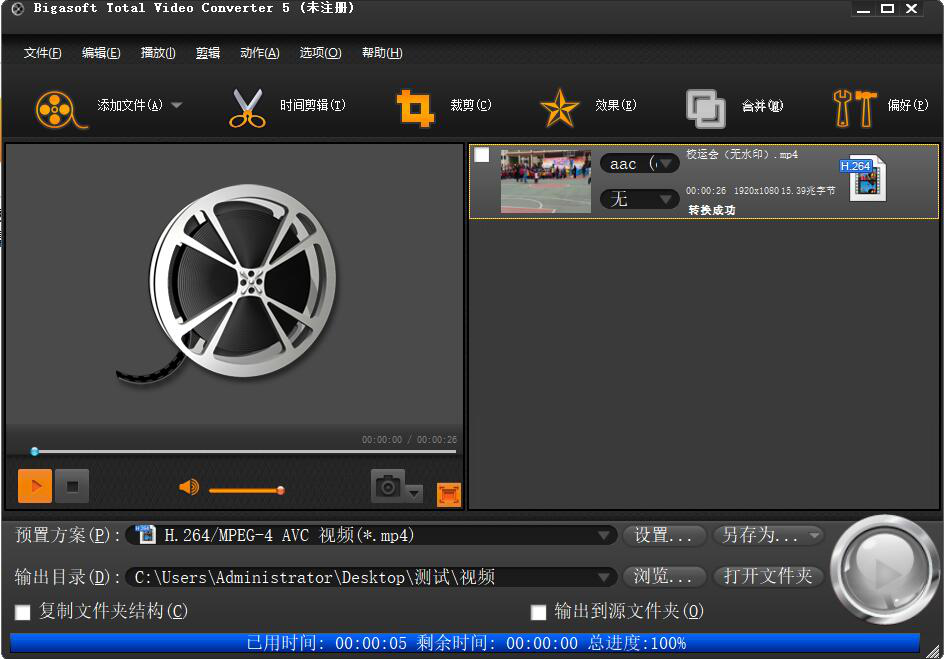 9、最后,当进度显示100%的时候,说明Bigasoft Total Video Converter成功地将彩色视频变成了黑白视频。