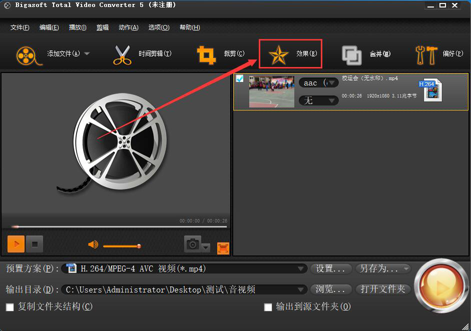 3、然后,回到Bigasoft Total Video Converter操作界面,点击功能栏中的“效果”选项。