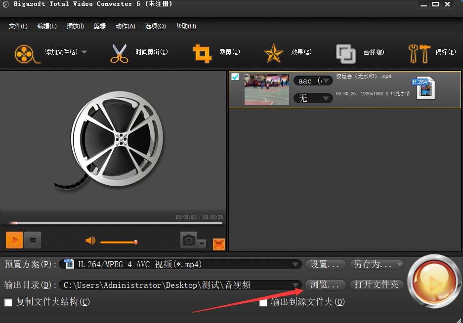 5、接下来,回到Bigasoft Total Video Converter操作界面,如果视频的输出目录要更改,就点击“浏览”按钮。
