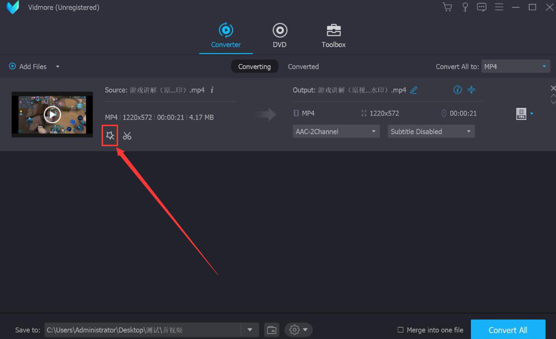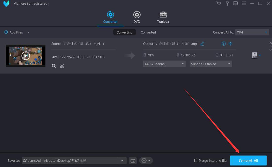 7、为视频添加的特效和输出路径都确定不需要更改的话,就点击Vidmore界面右下方的“Convert All”按钮,Vidmore便开始转换添加了特效的这个视频。