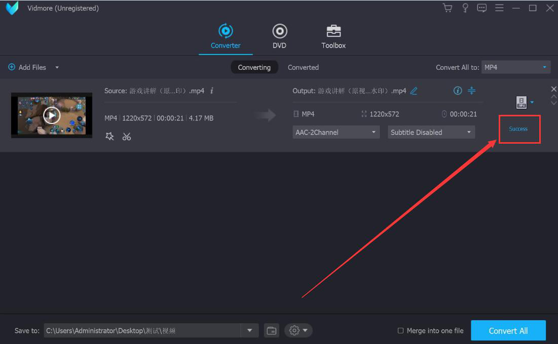 8、最后,当视频中显示“Success”时,则说明Vidmore已经将添加了特效的视频保存到指定的路径了。