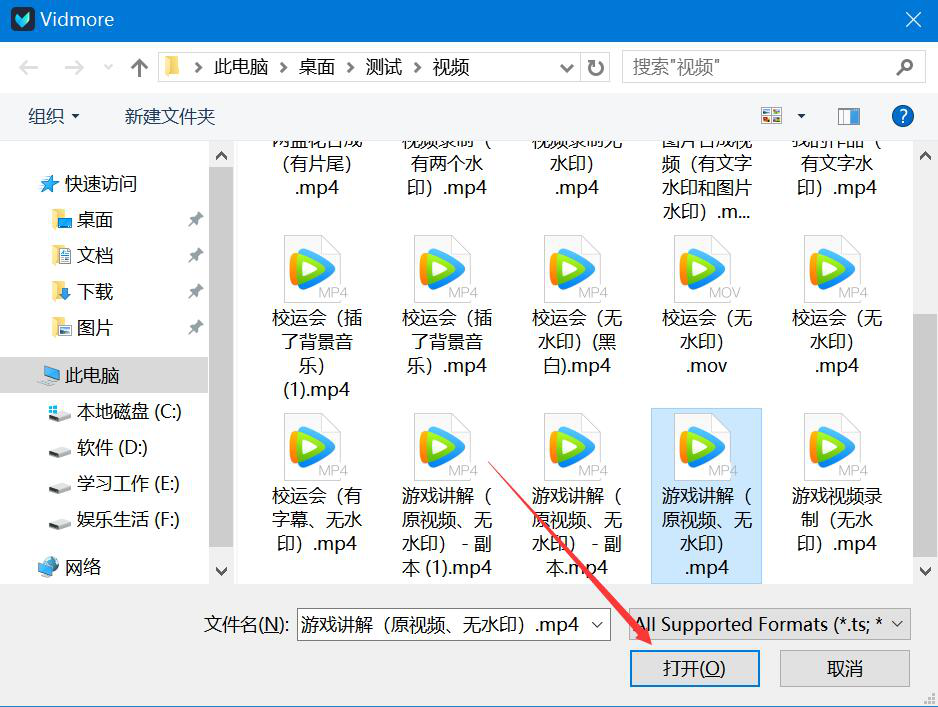 2、在弹出的窗口中,选择需要添加特效的视频文件,并点击“打开”按钮,将它导入Vidmore。
