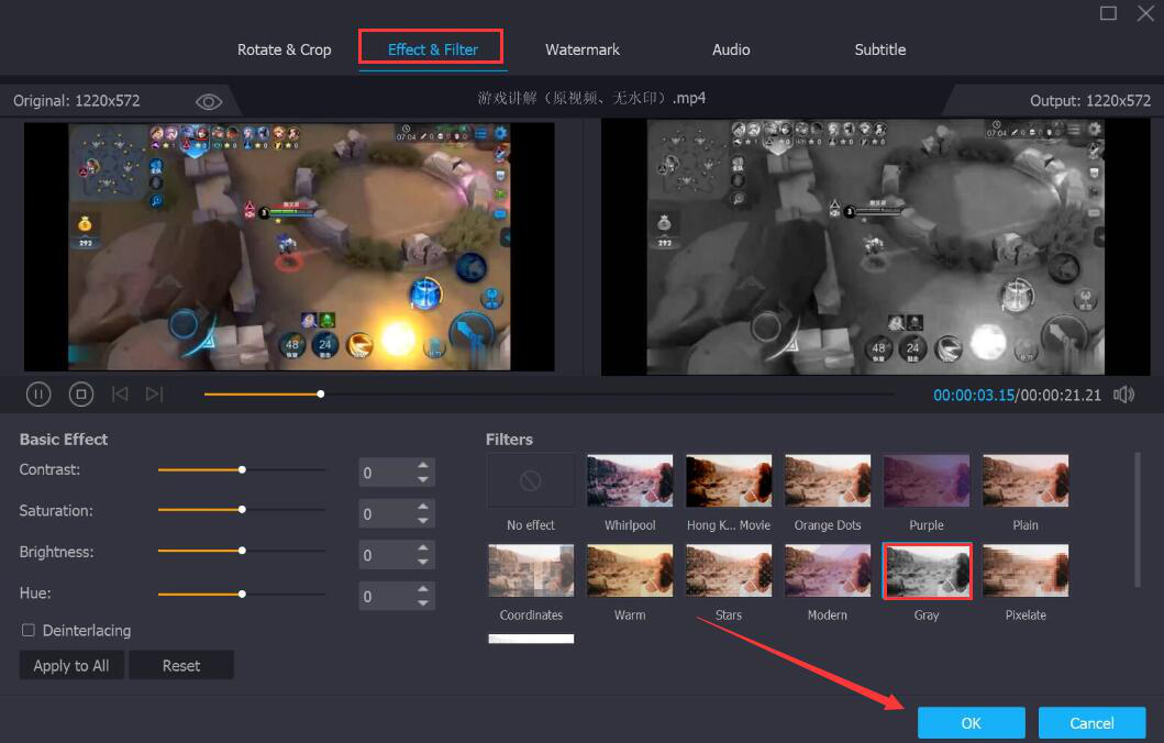 4、接下来,进入Vidmore特效设置界面,切换至“Effect& Filter”选项卡。在此选项卡中,可以看到Vidmore有很多特效,我们从中点击应用自己想给视频添加的特效样式,再点击“OK”按钮。