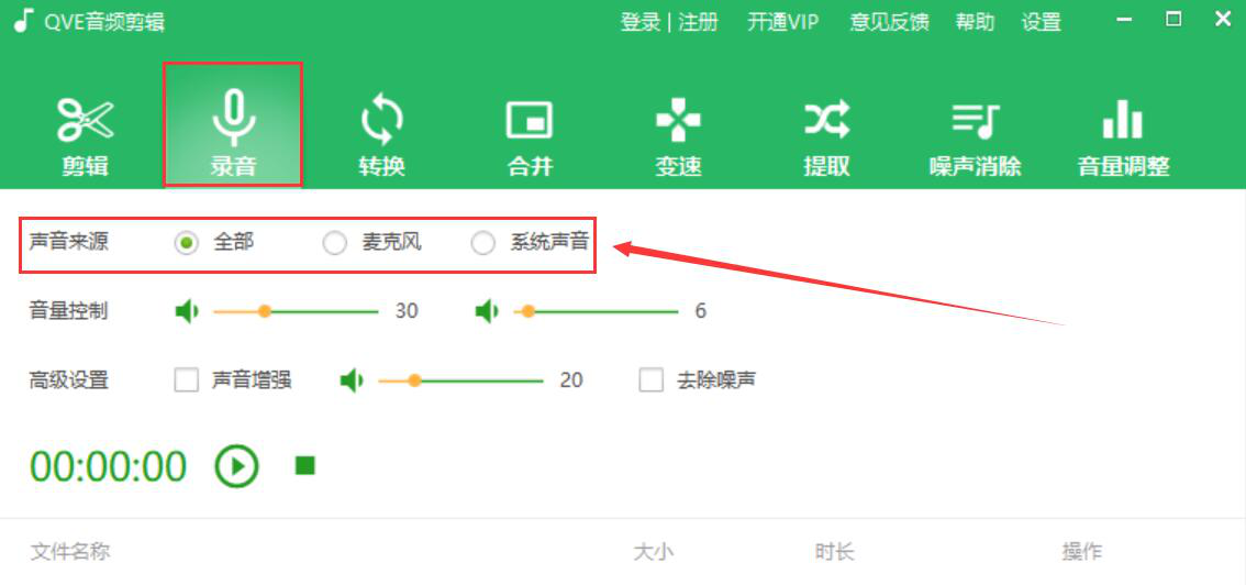 1、首先,我们打开QVE音频剪辑,先切换至“录音”操作界面,根据自己的需要选择录制音频时的声音来源。