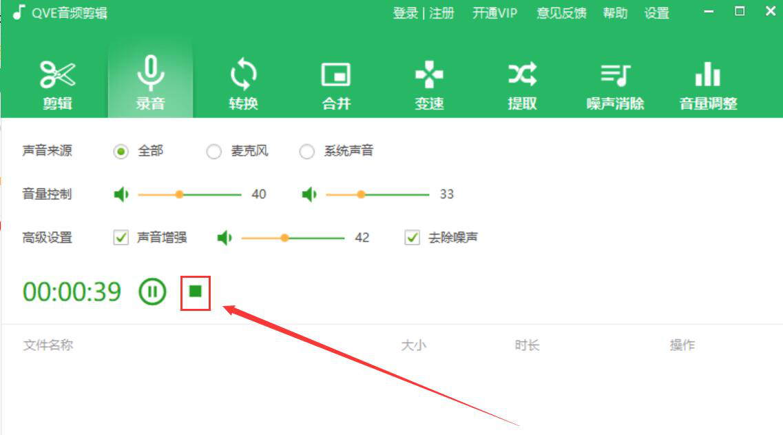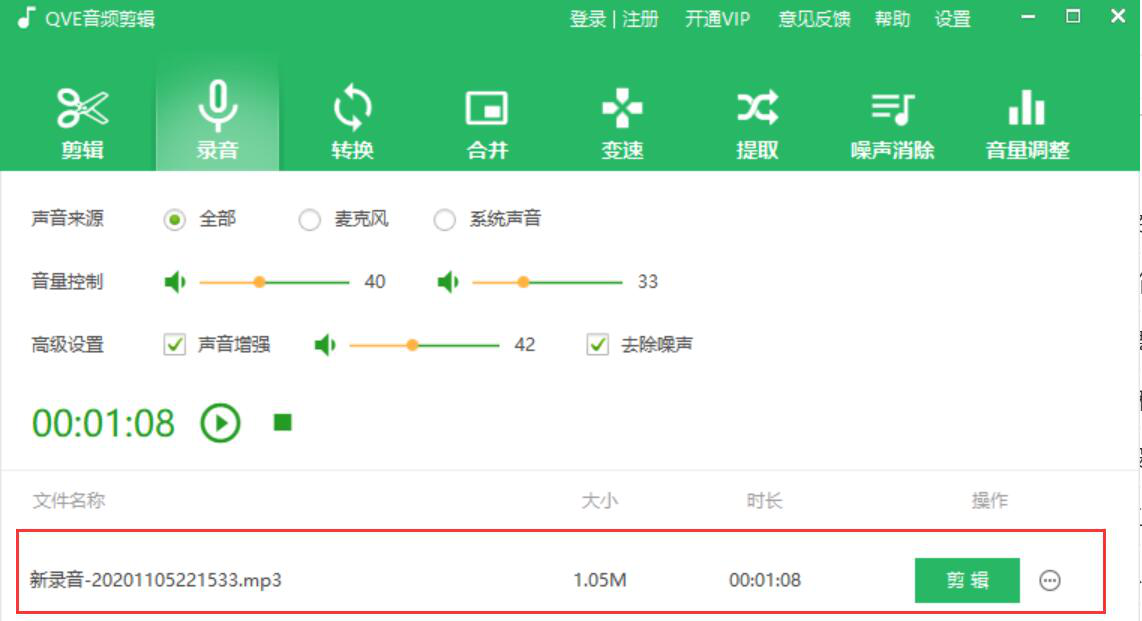 2、然后,根据自己录制的音频的需要,调节音量大小。如果想录制的音频音质更佳,就勾选“声音增强”,并适当调节增强的程度。当然了,还要勾选“去除噪音”,这样一来,QVE音频剪辑录制的音频音质就会更加优秀。