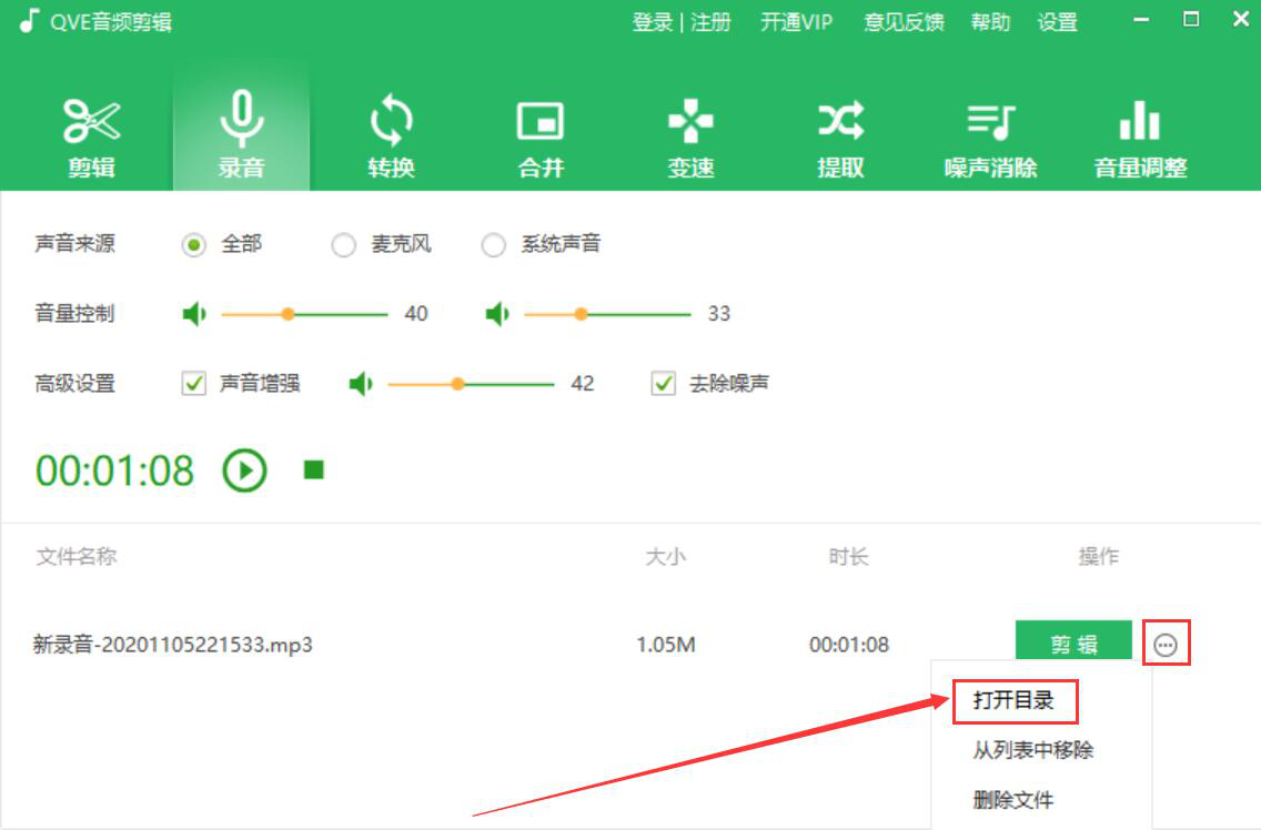 7、最后,点击音频中的“…”按钮,并从它弹出的选项中点击“打开目录”即可快速看到QVE音频剪辑录制的音频了。