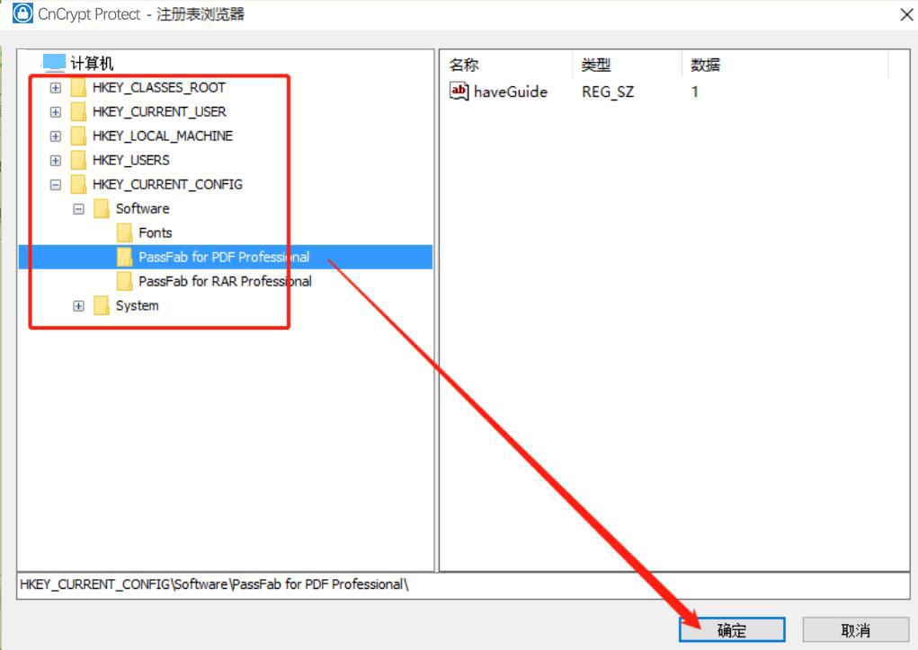 3、接下来,在注册表浏览器中,我们选择自己想要CnCrypt Protect锁定的注册表信息,再单击界面右下方的“确定”按钮。